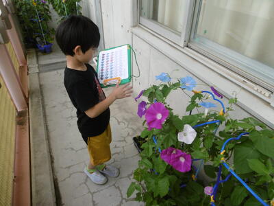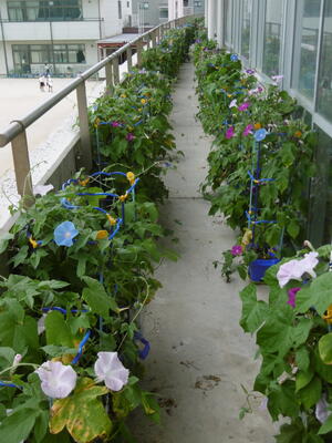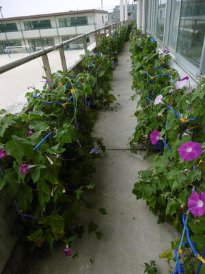 1年生が一生懸命お世話をしているアサガオ!ベランダは、「アサガオロード」になっています!さあ、今日はいくつ咲いているかな。