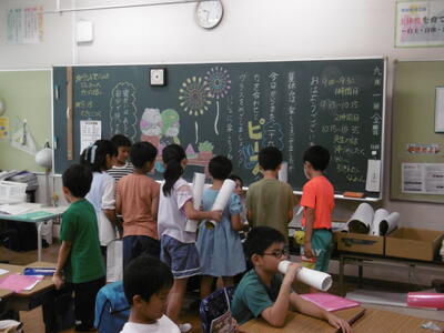 ♪笹の葉さらさら 軒端にゆれる…。今日、7月7日は七夕。子どもたちは、どんな願いを短冊に託したでしょう。「ぱんやさんになれますように(1年生)」、「サッカーのリフティングが45回できますように(2年生)」、「世界に平和がおとずれますように(3年生)「好きな子とけっこんできますように(4年生)」「妙典ドリームスが強豪校になれますように(5年生)」「よい本と出会えますように(6年生)」…。妙典っ子の願い事が、かないますように。