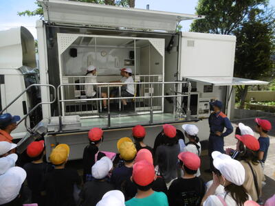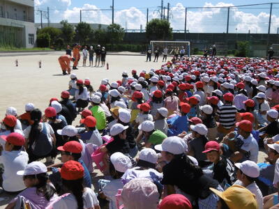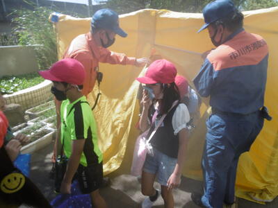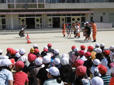 今回の避難訓練は、地震から火災発生を想定した校庭への避難に加え、消防署の方々のご指導の下、消火器を使った消火訓練(全校・6年代表)、煙中脱出体験(4年生)、起震車体験(6年生)を4年ぶりに実施しました。実際に火災を発見した場合は、子どもは「知らせて逃げる」が基本ですが、消火器の使い方を知っておくことも大事。6年代表児童は、手順通りに的確に操作し、見事模擬消火に成功しました。煙中脱出体験では、4年生が煙(無害)の充満するテントの中をハンカチで口や鼻をおさえ、身をかがめながら、すばやく脱出!また、起震車体験では、6年生が震度7の揺れの激しさを体感しました。いざという時に、「自分の命を自分で守る」ために、日頃の心と体の準備が大切ですね。ご家庭でも、子どもたちの感想を聞いてあげてください。※HP「校長室から」に校長先生のお話を掲載しました。併せてご高覧ください。