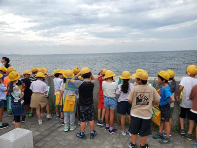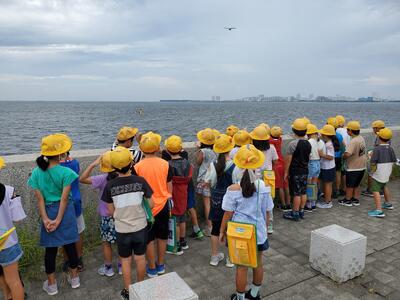 社会科では「市川市の南は工場・倉庫が多い」と教わりました。たしかに、海の反対側は倉庫だらけ。でも、みんなの視線はやっぱり海ですね。ノリ養殖のための支柱も見えます。行徳海苔は高品質で有名です。