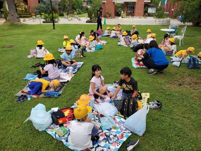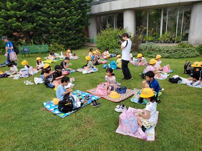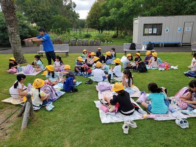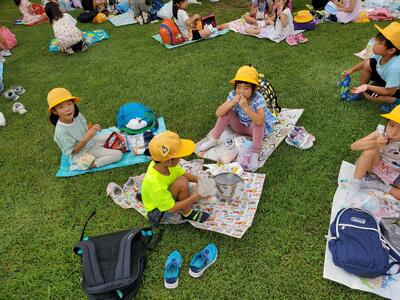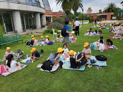 夢の島熱帯植物館につきました。すこし日が差すくらいのお天気ですので、芝生でわいわいお昼ごはんです。お弁当のご準備ありがとうございました。