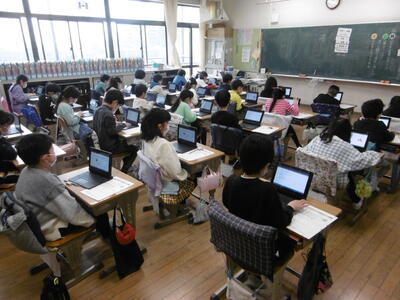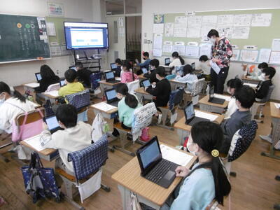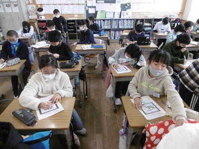 本校では、3~6年生が、千葉県教育委員会の学力向上施策の一つである「ちばっ子学びの未来デザインシート」に取り組んでいます。これは、児童が複数の教科で学習したことを組み合わせながら「生きて働く力」として活用できるかどうか、学力の習得状況を測るための調査です。実施方法は、CBT(computer based test)形式。一人一台端末(タブレット)を活用して実施します。各学年とも「動画等を視聴して解く」というCBTならではの特色ある問題も出題されています。
