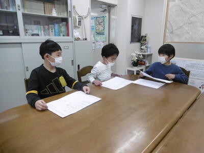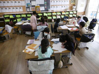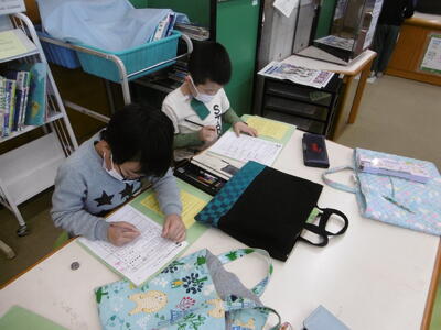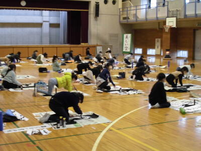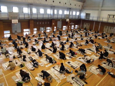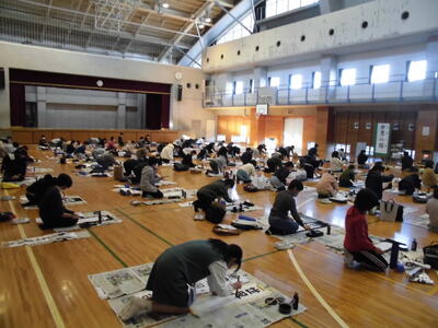 5年生の書き初めの課題は、「世界の国」。画数も多く難しい課題ですが、子供達はお手本をよく見て、力強く書いていました。