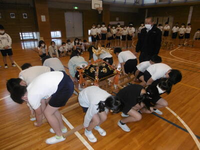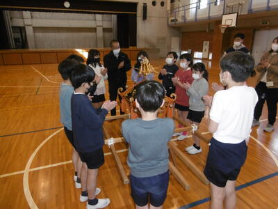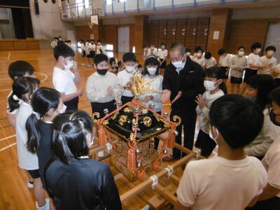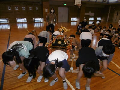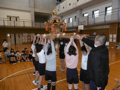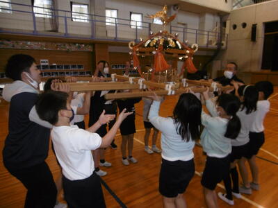 4年生が、中台製作所の中臺さんを学校にお迎えし、神輿の揉み方(担ぎ方)を教えていただきました。すでに、神輿ミュージアムの見学に行っている子どもたちは、興味津々!実際にお神輿を担ぎながら、中臺さんから、「地すり」、「差し」、「放り受け」「回し」など、独特の「揉み方」を教えていただき、大興奮です。「わっしょい!わっしょい!」という元気な掛け声にも、よりいっそう力強さが増していました。「思っていたより重かった!」「頭の上まで持ち上げるなんてびっくりした!」「お囃子も聞いてみたい!」など、新たな発見や願いがたくさんあったようです。2月のOSDで保護者の皆様にも見ていただく予定です。