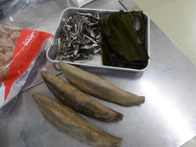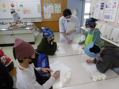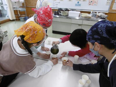 5年生が、家庭科調理実習「味噌汁づくり」に先立ち、「出汁(だし)」について学習しました。味には、「甘味」、「苦味」、「酸味」、「塩味」、「うま味」がありますが、「出汁」の味は、「うま味」にあたります。子どもたちは、栄養士の宇佐美先生のご指導の下、「かつおぶし」、「こんぶ」、「煮干し」の3種類の「利き出汁」にチャレンジ!味、におい、色などを比較・吟味しながら、しっかりとその特徴を捉えて選定していました。また、「出汁入り味噌汁」と「出汁無し味噌汁」の味比べをしました。「全然違う!」「出汁が入っている方が、ずっと美味しい!」「泣きたいくらい美味しい!」など、口々に感想があがっていました。日本料理の真髄を体感・実感し、出汁文化の奥深さに感激した子どもたちです。