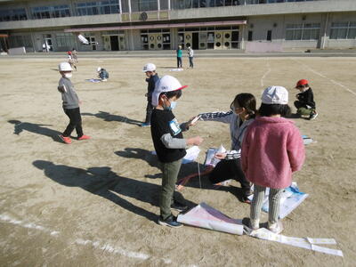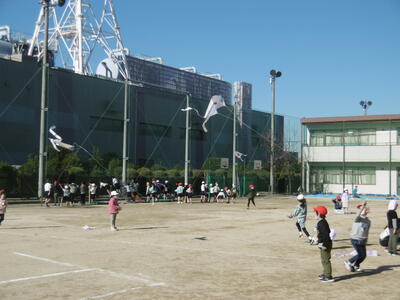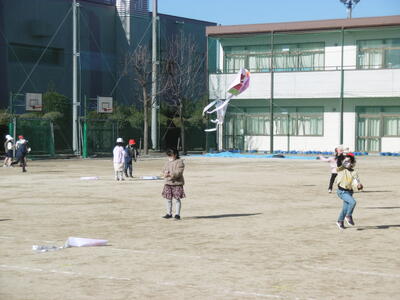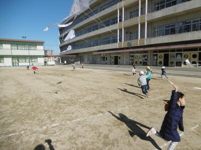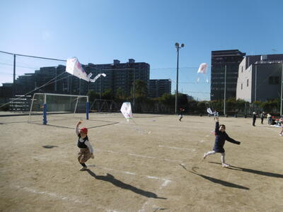 「あがった!あがった!」1年生が大きな歓声を上げながら、うれしそうに校庭を走り回っています。図工で作成した手作りのオリジナル凧が、子どもたちの後方から追いかけてきます。立ち止まって、タコ糸をタイミングよく手繰りながら、凧を上空に上げるのは、まだちょっと難しそうです。糸が絡んでしまうトラブルもあちらこちらで発生!でも、それでいいのです。天高くあげるには、どうすればよいか、文字通り、遊びながらコツを学んでいくのですね。