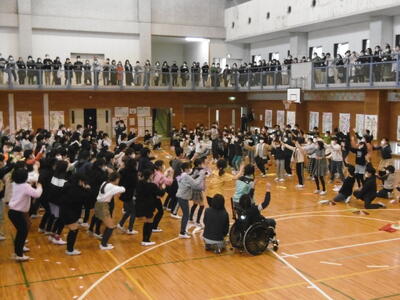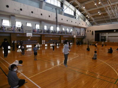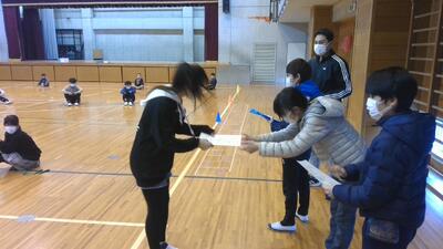 1月31日(火)、二重跳びリレー決勝戦!アリーナには、予選を勝ち抜いた精鋭6チーム(30名)が集合。2階のギャラリーでは、応援する子どもたちが、勝負の始まりを今か今かと固唾を飲んで見守っています。「子どもたちに負けていられない!」と、「先生チーム」も飛び入り参加です!いよいよスタート!笛の合図で、トップバッターの子どもたちが跳び始めと、一斉に歓声があがります。さすが、決勝!子どもたちの見事な跳びっぷりに、会場はさらに盛り上がります。が、徐々にチームが絞られ、残すはブラボー(6年生)とパイナップル(5年生)の一騎打ち!両チームとも、名誉をかけて必死!会場のボルテージも最高潮です。結果は、…最上級生の「意地」で見事、「ブラボー」の優勝!ガッツポーズで喜びを爆発させていました。表彰式では、体育委員会から各チームに表彰状が授与され、子どもたちは満面の笑顔でした。因みに、先生チームは、第4位!悔しい~!来年、リベンジします!