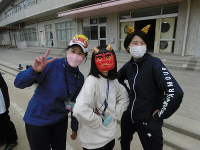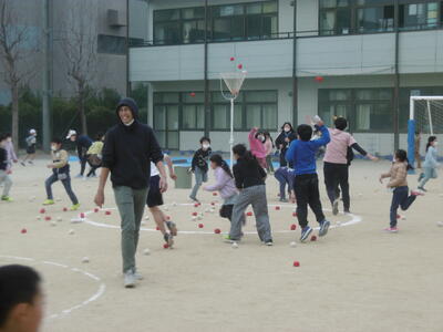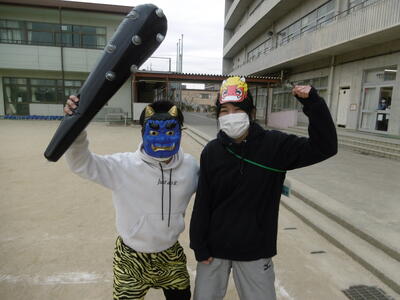 節分、校庭に突然「鬼」が大集合!3年生と4年生(1クラス)の子どもたちが、文字通り「鬼ごっこ」で大いに盛り上がりました。「悪い子はいねえかあ~!」なまはげもびっくりの迫力で、何人もの鬼が、子どもたちを追いかけてきます。鬼に捕まると、校庭の真ん中にある「鬼が島」に連れていかれます。子どもたちは、歓声をあげながら逃げるのに必死!鬼を撃退するアイテムは、玉入れに使う「お手玉」。鬼をめがけて投げつけます。「豆まき」ではなく「玉まき」です。約30分間にわたる大鬼ごっこに子どもたちは、「おもしろかったあ」と笑顔いっぱい!対して鬼たちは、疲労困憊…。でも、子どもたちが喜んでくれて、先生方も大満足の笑顔です。…月曜日の勤務、筋肉痛が心配です(笑)
