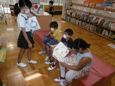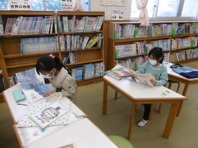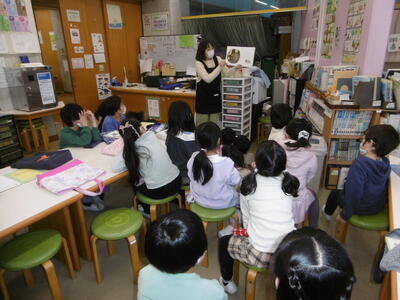 入学してもうすぐ1年を迎える1年生。学校図書館ともすっかり仲良しです。自分が読みたい本を探す方法や読書カードの書き方、予約の仕方や貸し出し・返却の仕方もしっかりと覚えて、図書館ライフを楽しんでいます。図書の時間には、学校司書の梅木先生が読み聞かせをしてくださるのも楽しみですね。「今日は、どんなお話だろう。」子どもたちは、目を輝かせながら、お話を聞いています。本校では、豊かな心と確かな知識の基盤となる読書活動の充実を図っています。