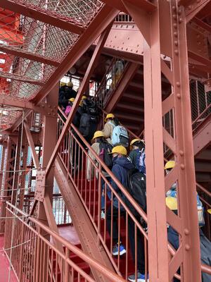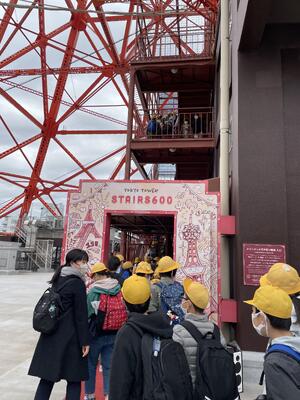 東京タワー、600段を登りきりました!子供達は元気に景色を楽しんでいます。これからお弁当です。