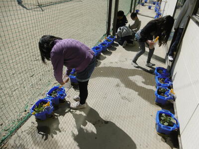 大根、ラディッシュ、水菜、ホウレンソウ…。2年生が一人一鉢栽培で育てている「冬の野菜」が、収穫の最盛期を迎えています。「大きくなってる!」子どもたちは、青々と茂った若葉をうれしそうにながめながら、成長の記録と収穫を楽しんでいます。採れた野菜は、ビニール袋に入れて家まで大切に持ち帰ります。収穫後も、葉っぱがまた伸びてくることを願いながら、水やりにもいっそう気合が入っていました。子どもたちが一生懸命育てた瑞々しい冬野菜、ぜひ、ご賞味ください。