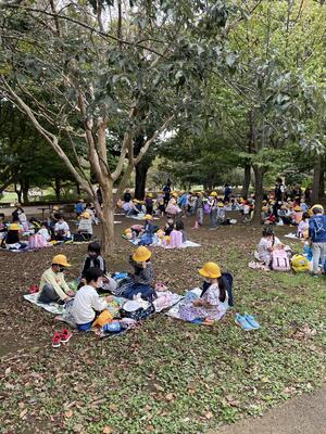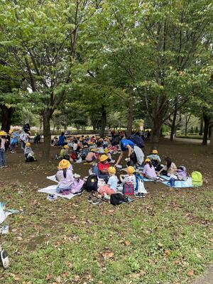 待ちに待ったお弁当タイムです。集合時刻の前から、おなかすいた〜、の声。おいしいお弁当を食べています。