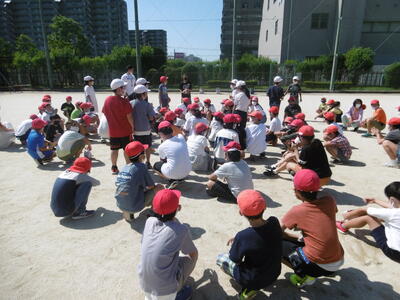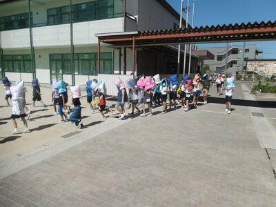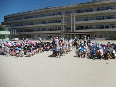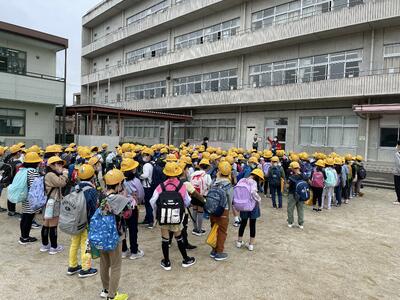 「関東地方に大地震が発生、その後、給食室から火災が発生した」という想定の下、避難経路を通って、各教室から校庭まで避難しました。全校児童が避難完了までにかかった時間は6分8秒でした。今年度初めての校庭への避難でしたが、「おかしも」(おさない、かけない、しゃべらない、もどらない)の約束を守って、一人一人が真剣に取り組むことができました。