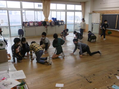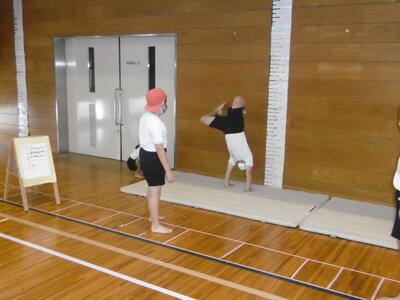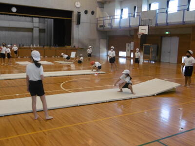 4年生では、体育の時間に「マット運動」に取り組んでいます。子どもたちは、いろいろな技にチャレンジしながら、マット運動の楽しさやできた時の達成感を味わっています。練習では、自分で「めあて」を立て、めあてに応じた練習の場を自分で選んで、友達と一緒に技のポイントなどをアドバイスし合いながら、一生懸命練習しています。練習を重ねるたびに、あちらこちらから「できた!」と歓声が上がっています。