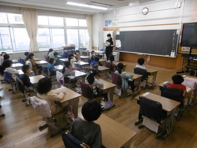 2年生では、道徳の授業をローテーションで行っています。通常は、道徳は担任が指導しますが、2年生では、1~5組の担任が、それぞれ一つの資料(題材)を担当し、全学級をローテーションしながら指導していきます。子どもたちにとっては、週1時間の道徳授業は、他学級の先生と一緒に学習することになります。担任の先生以外との学習は、新鮮で子どもたちにも好評です。教師にとっては、一つの資料(題材)について5回授業することになるので、教材研究や指導の工夫をさらに充実させることができます。また、子どもたちの様子を、広く学年全体で共有できることも魅力です。学級の枠を超えた「学年担任制」の形態の一つとして、高学年の「教科担任制」へとつながる試みです。