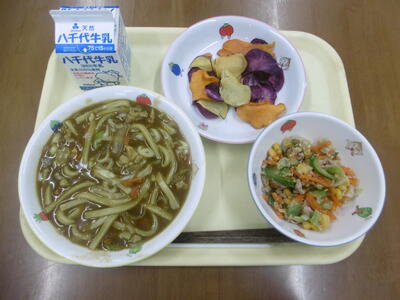 「もぐもぐタイムになりました。今日の献立をお知らせします。カレーうどん、やきにくサラダ、三色さつまチップス。牛乳です。今日のワンポイントは、三色さつまチップスについてです。原木にある農家の〇〇ファームさんで採れたものです。夏の記録的な猛暑にも、雹にも、長雨にも負けず、大切に育ててくださいました。黄色、オレンジ色、、紫色の三色を使っています。どんな味の違いがあるのか、比べてみましょう。」