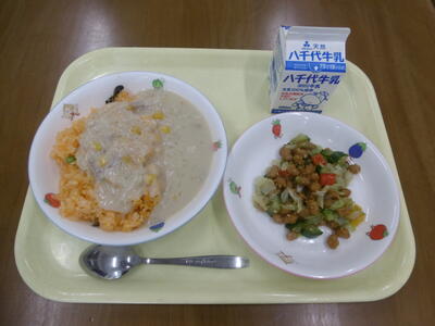 「もぐもぐタイムになりました。今日の献立をお知らせします。キャロットピラフホワイトソースがけ、揚げ大豆のサラダ、牛乳です。今日のワンポイントは、ホワイトソースについてです。オレンジ色が鮮やかなキャロットピラフにかけるのは、ホワイトソースです。普段は、牛乳、バター、小麦粉を使用して作りますが、今日は牛乳の代わりに豆乳、小麦粉の代わりに米粉を使っています。味にはどんな違いがあるか見つけてみましょう。」