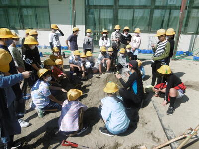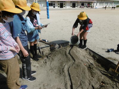 5年生では、理科で「流れる水のはたらきと土地の変化」について学習しています。この日は、実際に砂場で「流水実験」を行いました。グループごとに、スコップで大きな山を作り、山肌にカーブした溝を掘って、そこに水を流し、流れる水の様子や流した後の溝の状態を観察します。 また、学習用端末(タブレット)を使ってその様子を録画し、後で何度も視聴できるようにしています。子どもたちは、流す水の量を調整しながら、楽しそうに実験を繰り返していました。上流と下級での流れる水の速さの違い、カーブの内側と外側での浸食の違いなどポイントを押さえて、じっくりと比較・観察する姿は、科学的な見方・考え方が育ってきている証ですね。