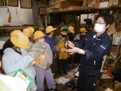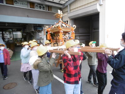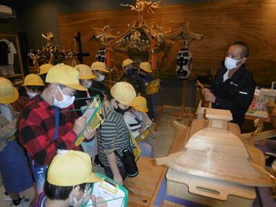 4年生では、総合的な学習の時間に「妙典の町」をテーマに探究学習に取り組んでいます。歴史、文化、自然など、妙典には魅力が、いっぱい!子どもたちは、町探検での発見や気付きをもとに、「自分の知りたいこと」について、さらに学びを深めています。先日は、2組、3組が、「神輿(みこし)のなぞ」について調べるために、「行徳神輿ミュージアム」の見学に行きました。中台製作所の社長さんから、神輿の実物を前に、その構造や製作工程、材料となる木材、漆、金属などについて「たくさんのひみつ」を教えていただきました。「神輿は、釘や接着剤を一切使わないで、組み立てているんだよ」と聞いて、子どもたちは、びっくり!その理由には、「なるほど!」と納得していました。職人さんの実際の仕事の様子も見学させていただき、カンナ削りや彫金の「職人技」に舌を巻いていました。最後は、みんなでお神輿も担がせていただき、大満足の笑顔でした。