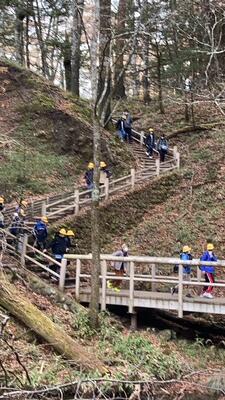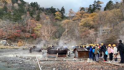 湯元の源泉に到着しました。あたり一面に漂う硫黄の匂いに子供達も大興奮!おかげさまで、妙典っ子の気持ちは、既にひとっ風呂浴びた気分です。