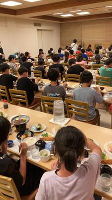 たくさん活動してお腹ペコペコの子どもたち。おまちかねの夕食タイムです。美味しそうなゴージャスメニューに子どもたちも、笑顔いっぱいです。