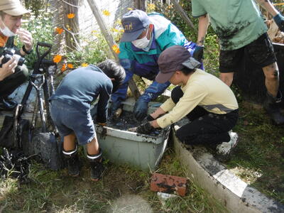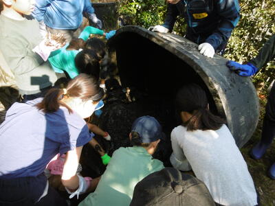 「妙典小ハス田クラブ」の皆さんが「レンコンの収穫体験」をしました。参加した子どもたちは、元ハス農家の篠田務さんや地域学校協働活動推進員の安達さんをはじめ、環境保護団体「三番瀬フォーラム」の皆さんのサポートのもと、作業を開始。まずは、みんなで協力してハス池の水をバケツリレーで汲み出し、水が少なくなったところで、ハス池の中から、手探りでレンコンを掘り当てていきます。子どもたちは、泥んこになりながら、「とったど~!」「これ、大きい!」と、次々にレンコンを手にして大はしゃぎ。掘ってみるまでレンコンができているかどうか心配でしたが、思わぬ大豊作!苦労して収穫したハスは、その場でバターしょう油風味の「レンコン・ステーキ」にして、試食しました。「おいし~い!」ホクホクとした食感とほのかな甘味に、子どもたちも笑顔いっぱいでした。子どもたちにとっては、地域の文化や自然に触れることのできる貴重な体験ですね。来年の植え付け、収穫も楽しみです。なお、「妙典小ハス田クラブ」の活動の様子を撮影した写真を妙典小教室棟1階に掲示しています。ぜひ、ご覧ください。