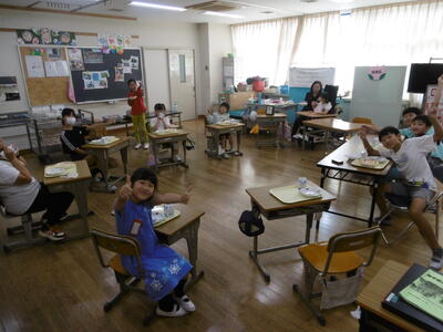 「♬あったかはあとが、パスポート♪」校歌のBGMが流れる中、全校で「あったかはあと給食」を実施しました。普段は、学級ごとに食べている給食ですが、この日は、異年齢の子どもたちが、ペア学年(6年生と1年生、5年生と3年生、4年生と3年生)ごとに、会食しました。楽しいおしゃべりに、給食のハヤシライスがいつもにも増して、さらにおいしく感じます。準備や後片付けでは、上級生が下級生をリードする姿も頼もしいです。おなかがいっぱいになった昼休みは、ペア学年での遊びに夢中!特に、1年生は6年生のお兄さん、おねえさんに遊んでもらって、大喜びでした。