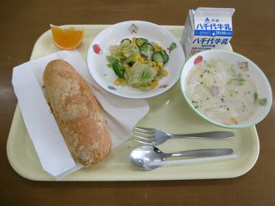 ・牛乳 ・きなこあげパン ・コーンサラダ ・白菜とベーコンのミルク煮 ・オレンジ(紅まどんな)