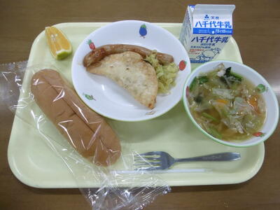 ・牛乳 ・セルフホットドック ・ABCスープ ・ツナとチーズの包み揚げ ・オレンジ