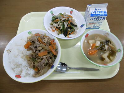・牛乳 ・豚肉のカルビ丼 ・生揚げの味噌汁 ・わかめとこんにゃくのサラダ