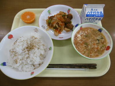 ・牛乳 ・ごま塩ごはん ・かぼちゃと団子の甘酢あんかけ ・トマトと卵の中華スープ ・はなみかん