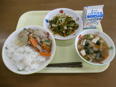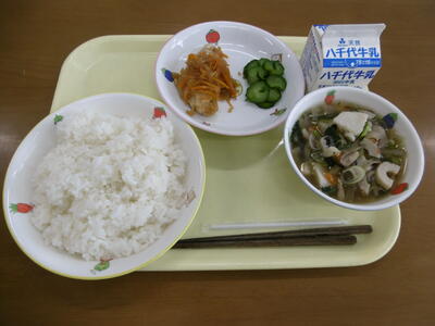 ・牛乳 ・ごはん ・豚肉の生姜焼き ・茎わかめのサラダ ・けんちん汁