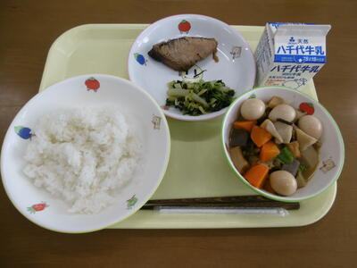 ・牛乳 ・ごはん ・ブリの照り焼き ・からし和え ・うずらと里芋のうま煮