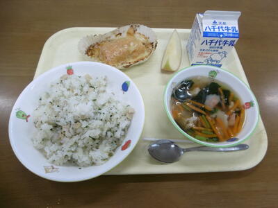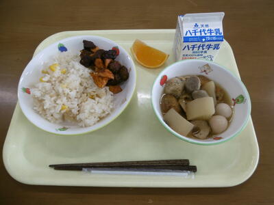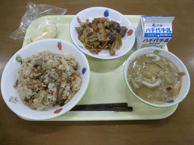 ・牛乳 ・とりごぼうごはん ・レンコンのショウガ煮 ・さつまいもの味噌汁 ・りんご