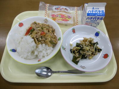 ・牛乳 ・チンジャオロース丼 ・ねぎナムル ・みかんクレープ