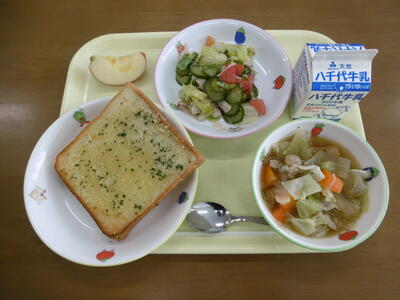 ・牛乳 ・ガーリックトースト ・ポトフ ・フレンチサラダ ・りんご