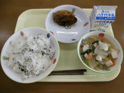 ・牛乳 ごましおごはん ・手作りキャベツメンチ ・豚汁
