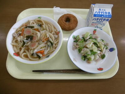 ・牛乳 ・わかめうどん ・ビーンズサラダ ・「バムとケロのにちようび」よりドーナツ