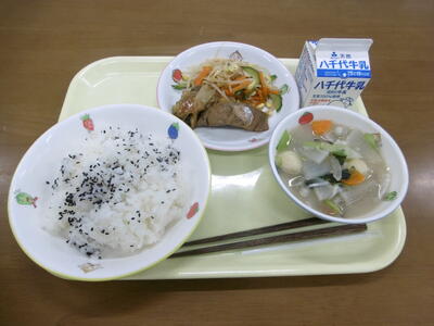 ・牛乳 ・ごま塩ごはん ・サバの甘露煮 ・豆もやしの和え物 ・いももち汁