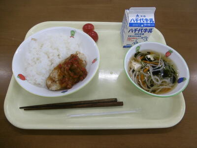・牛乳 ・ごはん ・アジの南蛮漬け ・魚めんすまし汁 ・あまエルトマト