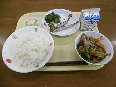 ・牛乳 ・ごはん ・焼きシシャモ ・きゅうりのおかか和え ・豚肉とごぼうのうま煮 ・型抜きチーズ