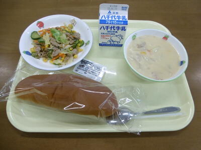 ・牛乳 ・はちみつパン ・チョコ&ホワイトクリーム ・焼肉サラダ ・コーンクリームシチュー