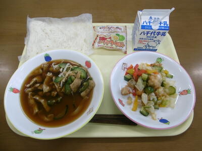 ・牛乳 ・ごはん ・さけのしょうゆ焼き ・いかときゅうりの和え物 ・筑前煮