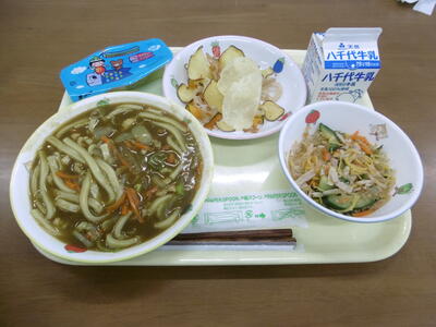 ・牛乳 ・カレーうどん ・野菜チップス ・かまぼこと糸寒天のサラダ ・こどもの日ゼリー