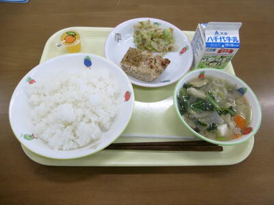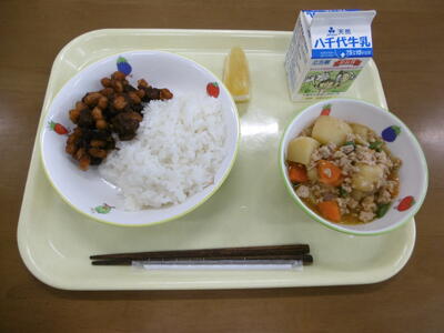 ・牛乳 ・ごはん ・鶏のから揚げ ・野菜の塩昆布和え ・インド煮 ・美生柑(果物)