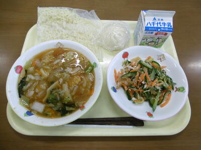 ・牛乳 ・小松菜と豚肉のあんかけそば ・クラゲの中華和え 千葉ポーク饅