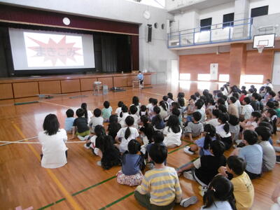 代表委員会主催による「1年生を迎える会」が開催されました。学年ごとに上級生が、1年生に向けて、学校の施設やお世話になる先生方、給食、学習、遊び様子などについて、楽しくわかりやすく紹介してくれました。1年生は、笑顔いっぱいで身を乗り出して見ていました。これからの学校生活がますます楽しみになりましたね。お礼に、1年生は、「ドキドキドン一年生」の歌を元気いっぱい歌いました。一人一人の「あったかはあと」が、アリーナいっぱいに溢れた素敵なひとときでした。会終了後、上級生が心を込めて手作りした「はあとメダル」が1年生に贈られると、子どもたちは首から下げたメダルを手に取り、何度も嬉しそうに見ていました。