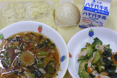 きょうのサラダ のわかめは、海そうの中でも骨や歯をじょうぶにするカルシウムを多く含んでいます。また、ビタミンA・ビタミンB1・ビタミンB2・鉄・ヨードなどの栄養素やお腹の調子をよくする食物繊維も多く含んでいます。わかめなどの海そうは、一度にたくさん食べるより、毎日、少しずつ食べるといいです。