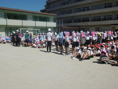 「関東地方に大地震が発生、その後、給食室から火災が発生した」という想定の下、避難経路を通って、各教室から校庭まで避難しました。全校児童が避難完了までにかかった時間は6分8秒でした。今年度初めての校庭への避難でしたが、「おかしも」(おさない、かけない、しゃべらない、もどらない)の約束を守って、一人一人が真剣に取り組むことができました。