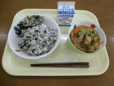 今日のご飯のわかめは、海そうの中でも骨や歯をじょうぶにするカルシウムを多く含んでいます。また、ビタミンA・ビタミンB1・ビタミンB2・鉄・ヨードなどの栄養素やお腹の調子をよくする食物繊維も多く含んでいます。わかめなどの海そうは、一度にたくさん食べるより、毎日、少しずつ食べるといいです。今日は、みなさんの大好きなわかめごはんに入っています。